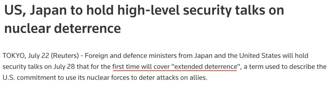 據(jù)多家外媒報(bào)道,日本和美國將于本月28日在東京舉行兩國外交部長和國防部長“2+2”會談,首次討論“延伸威懾”,即美國承諾使用包括核武器在內(nèi)的軍事力量保護(hù)盟國的問題。