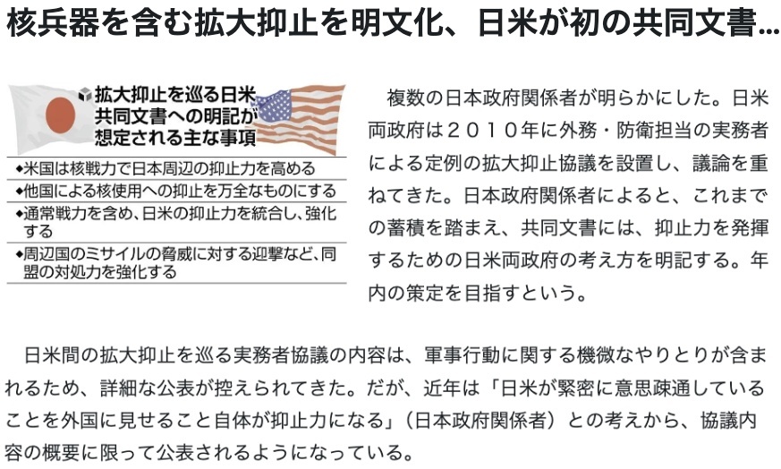 日本《讀賣新聞》援引未具名日本政府消息人士的話報(bào)道稱,日美兩國的目標(biāo)是在今年年內(nèi)出臺關(guān)于“延伸威懾”的首份聯(lián)合文件,其中將清楚地闡明“美國堅(jiān)定不移捍衛(wèi)日本”的承諾。