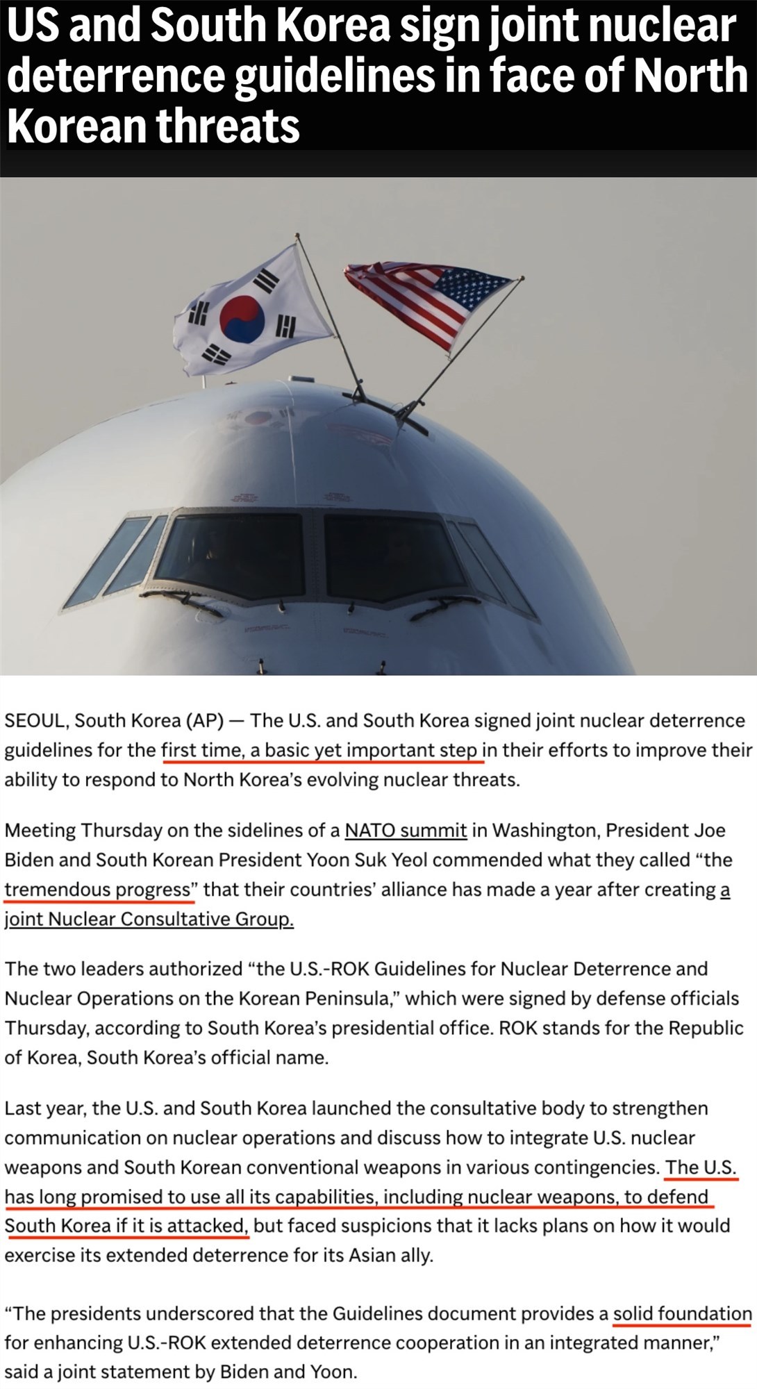本月11日,在北約華盛頓峰會間隙,美韓兩國國防部官員簽署《美韓關(guān)于朝鮮半島核威懾與核作戰(zhàn)的指導(dǎo)方針》。這也是兩國首次簽署此類文件,被認(rèn)為是“兩國努力提高應(yīng)對朝鮮核威脅能力的基本且重要的一步”。