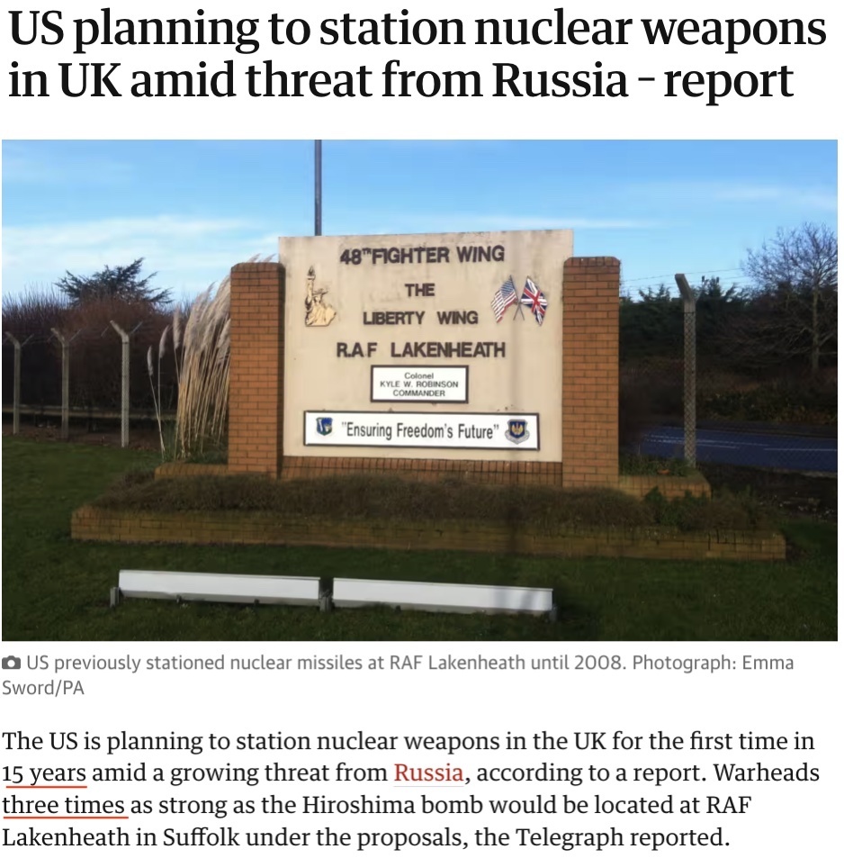 △英國《衛(wèi)報(bào)》:英國薩福克郡拉肯希思皇家空軍基地新設(shè)施的采購合同證實(shí),美國打算在該空軍基地部署三倍于轟炸廣島原子彈威力的核彈頭。