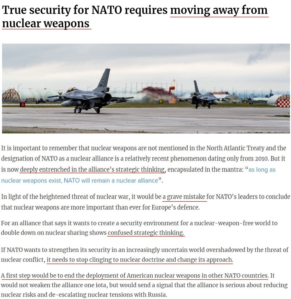 文章指出,《北大西洋公約》中并沒有提到核武器,但如今,它已深深根植于北約的戰(zhàn)略思想之中。鑒于核戰(zhàn)爭危險(xiǎn)的加劇,北約領(lǐng)導(dǎo)人如果斷定核武器對歐洲防務(wù)比以往任何時(shí)候都重要,那將是一個(gè)嚴(yán)重的錯(cuò)誤。