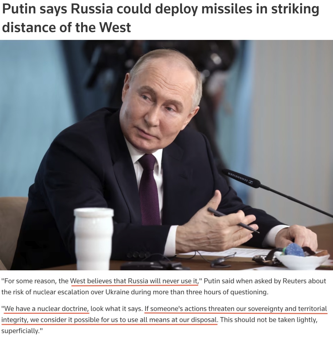 俄總統(tǒng)普京多次強(qiáng)調(diào),出于某種原因,西方認(rèn)為俄羅斯永遠(yuǎn)不會使用核武器,但俄羅斯有自己的核原則。