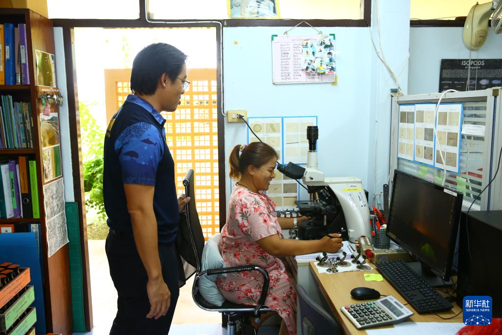 7月23日,在位于泰國普吉的中泰氣候與海洋生態(tài)系統(tǒng)聯(lián)合實驗室,差林拉·桑馬尼(左)與工作人員交談。新華社記者 孫瑋彤 攝