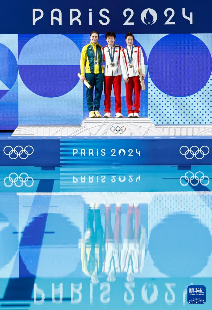 8月9日,冠軍中國選手陳藝文(左)、亞軍澳大利亞選手基尼(中)、季軍中國選手昌雅妮在頒獎儀式后。新華社記者 張玉薇 攝