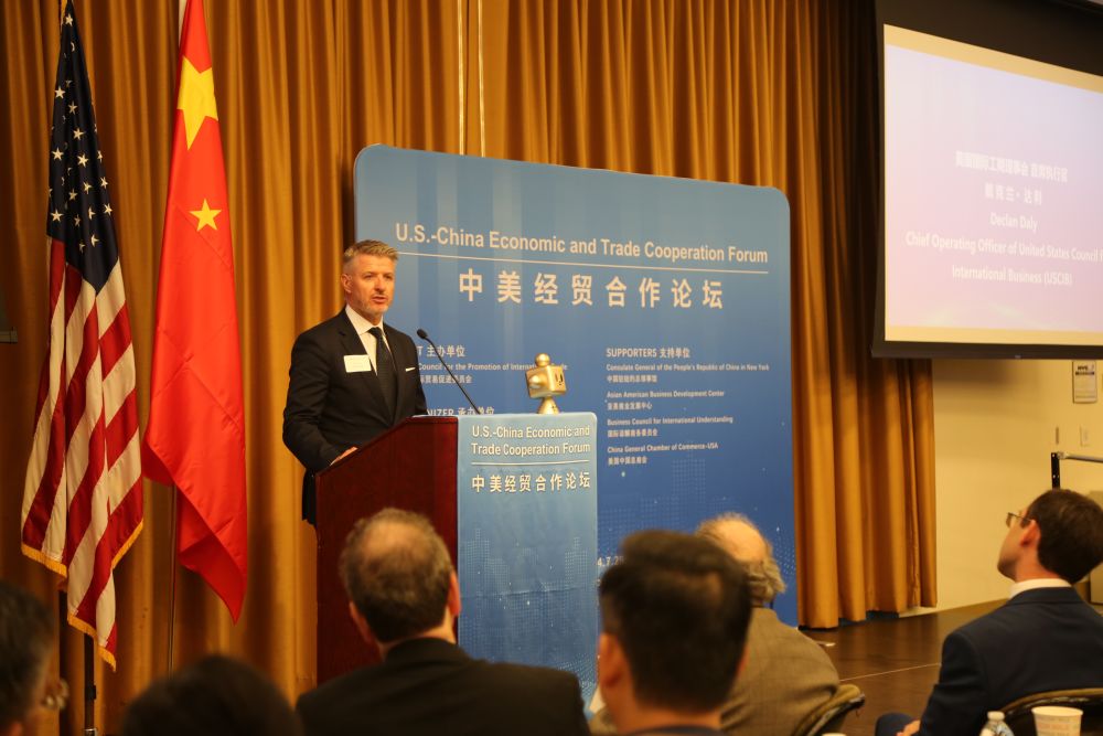 7月29日,在美國紐約,美國國際工商理事會首席運營官戴克蘭·達利在中國—美國經(jīng)貿(mào)合作論壇上致辭。中國—美國經(jīng)貿(mào)合作論壇29日在紐約市舉行,300余位中美企業(yè)及商協(xié)會代表出席。新華社記者劉亞南攝