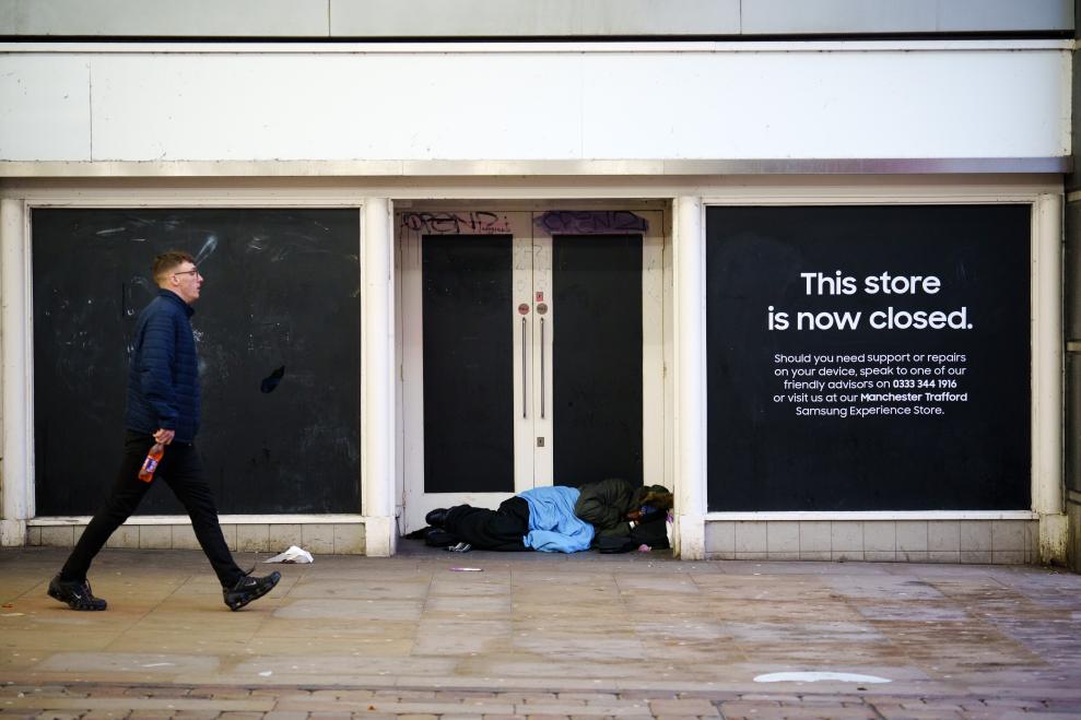 2023年11月22日,在英國(guó)曼徹斯特,一名無(wú)家可歸者躺在一家關(guān)閉的店鋪前。新華社發(fā)(喬恩·休珀攝)