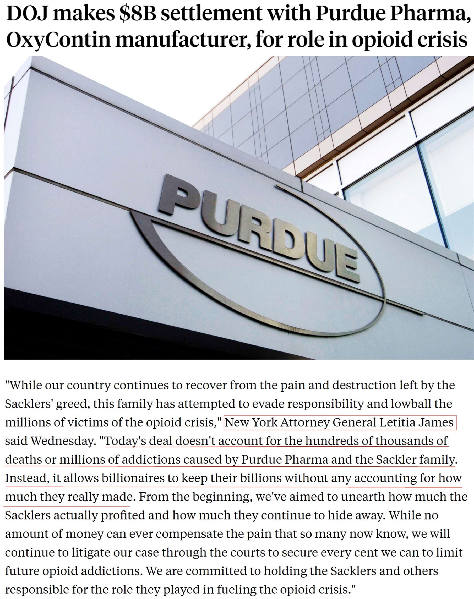 但紐約州總檢察長利蒂希婭·詹姆斯發(fā)表聲明,批評司法部與普渡制藥公司達成的和解協(xié)議,表示“協(xié)議不能解決普渡制藥公司和薩克勒家族造成的數(shù)十萬人死亡以及數(shù)百萬人成癮的現(xiàn)實。相反,和解協(xié)議使億萬富翁可以保留其數(shù)十億美元的資產(chǎn)而無需為他們實際造成的傷害付出代價?!?/p>