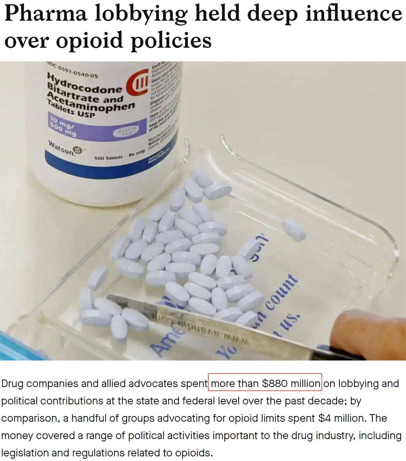 美國各種利益集團在藥物濫用問題上起著推波助瀾的作用。為維護市場利潤,美國大型醫(yī)藥企業(yè)投入大量資金,資助專家和協(xié)會兜售“阿片類藥物無害”論,進而推動毒品合法化,鼓動藥店大力推銷成癮藥品、醫(yī)師濫開藥用處方,使一些患者在不知情的情況下染上藥癮并無法自拔。