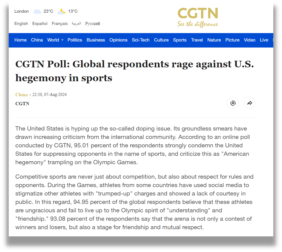 總臺CGTN先后兩次發(fā)起全球民調(diào),調(diào)查顯示,96.84%的受訪者認(rèn)為美方缺乏對世界反興奮劑機(jī)構(gòu)的尊重,是在挑戰(zhàn)公平和權(quán)威;96.25%的受訪者痛批美國在興奮劑監(jiān)管方面“雙重標(biāo)準(zhǔn)”;93.45%的受訪者表示,興奮劑問題日益被美國政治化和工具化;95.57%的受訪者認(rèn)為美國反興奮劑機(jī)構(gòu)或存包庇行為,為涉興奮劑的美國運(yùn)動(dòng)員開脫……