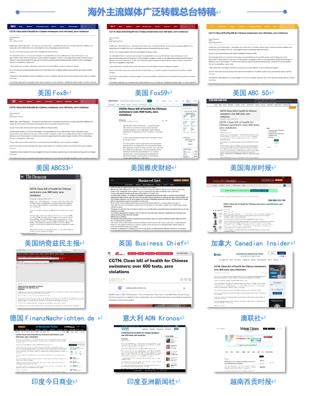 此外,多條重磅報(bào)道接連發(fā)出,直指美國在興奮劑問題上的霸道行徑及其危害,如《實(shí)錘!藥檢陽性不禁賽 世界反興奮劑機(jī)構(gòu)深度揭批美對違禁運(yùn)動(dòng)員操作內(nèi)幕》《干干凈凈比賽:中國游泳隊(duì)超600次藥檢,零違規(guī)》《美國濫施“長臂管轄”!反興奮劑“雙標(biāo)”何時(shí)休?》等。這些報(bào)道在多語種全平臺及時(shí)發(fā)布,獲海外主流媒體廣泛轉(zhuǎn)載,助力重樹全球運(yùn)動(dòng)員對公平競賽的信心。