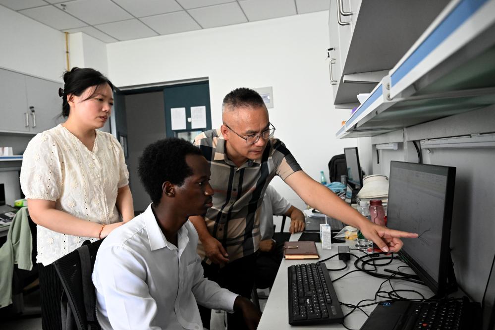 8月13日,在位于安徽省合肥市的安徽農(nóng)業(yè)大學,中方導師在指導一名盧旺達學生和其他學生學習。新華社記者黃博涵攝