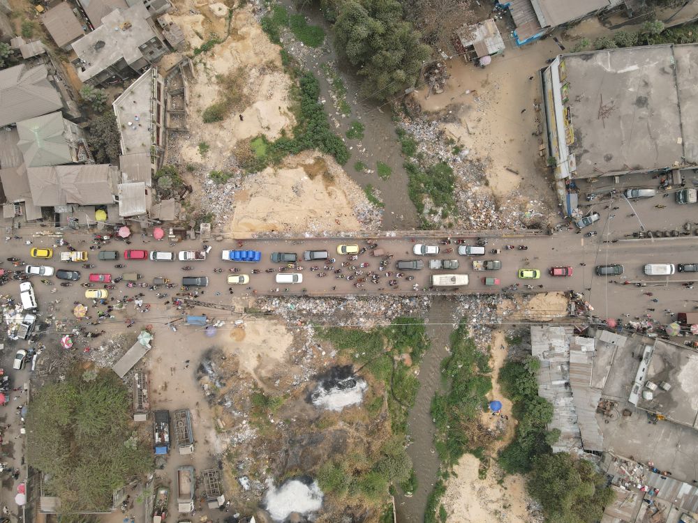 8月17日,在剛果(金)首都金沙薩郊區(qū)的金蘇卡大橋上,通行車輛在橋上駛過(guò)。(無(wú)人機(jī)照片)