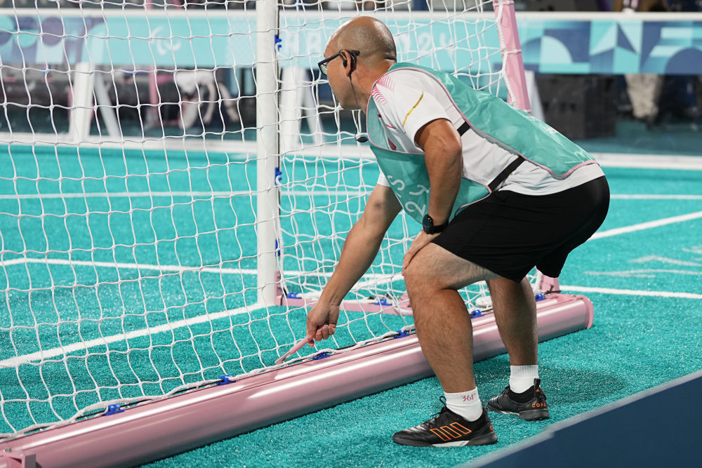 9月1日,中國隊引導(dǎo)員李進(jìn)在比賽中用金屬棒敲擊門框幫助球員定位。新華社記者 熊琦 攝