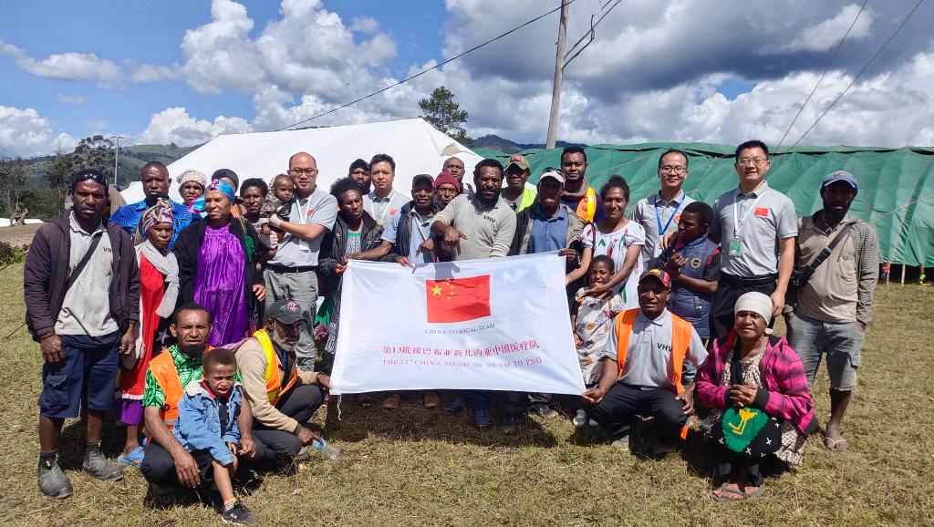 6月16日,在巴布亞新幾內亞恩加省的揚巴利村,中國醫(yī)療隊隊員與當?shù)鼐用窈嫌?。新華社發(fā)(第13批援巴布亞新幾內亞中國醫(yī)療隊供圖)