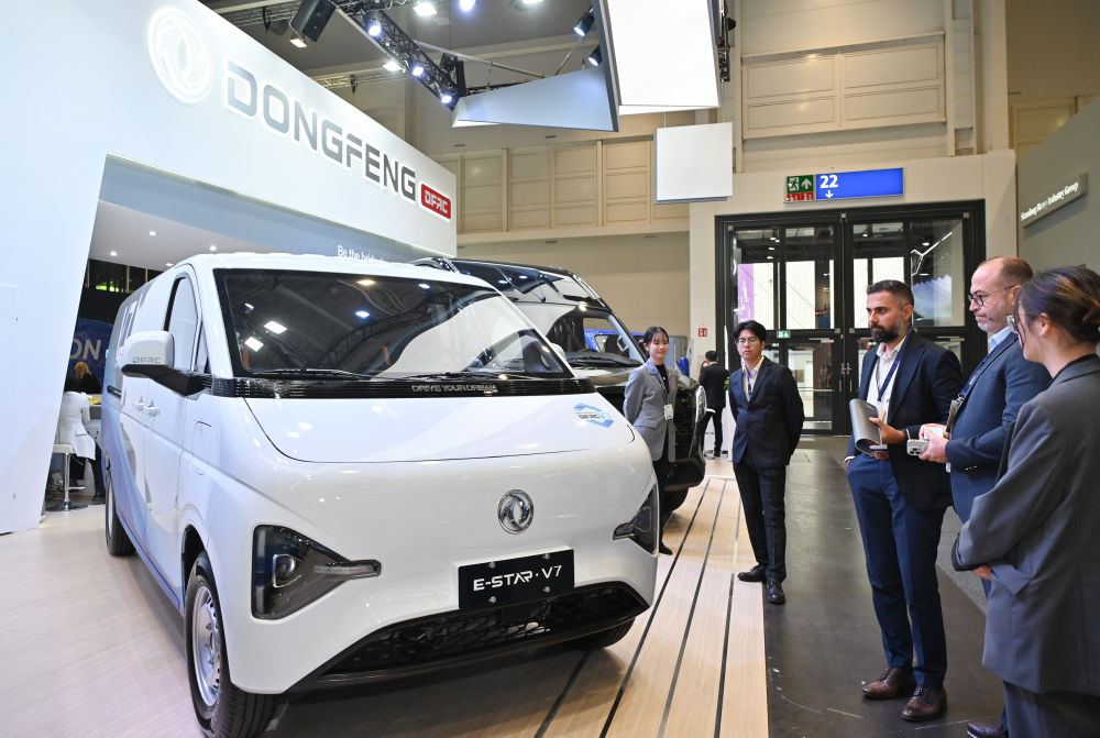 9月16日,在德國漢諾威國際交通運(yùn)輸博覽會媒體預(yù)展上,人們在東風(fēng)汽車展區(qū)參觀E-STAR V7商用車。新華社記者任鵬飛攝