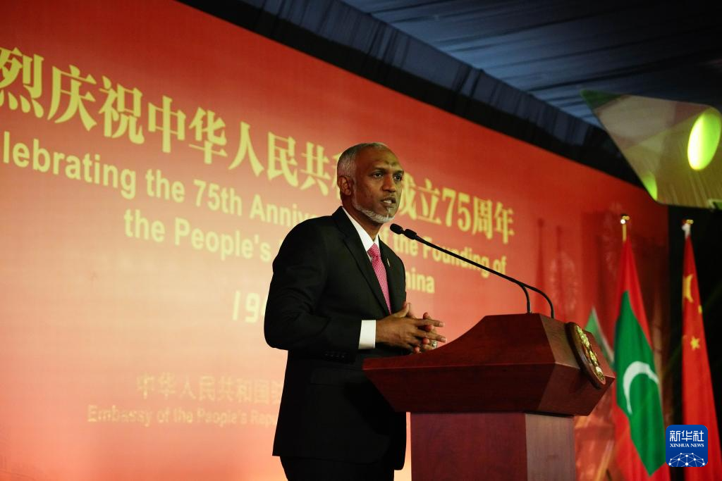9月30日,馬爾代夫總統(tǒng)穆伊茲在馬累舉行的慶祝中華人民共和國成立75周年招待會上致辭。新華社記者 陳冬書 攝