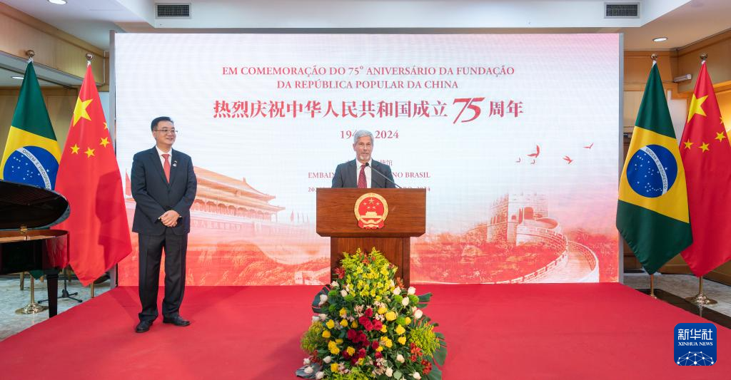 9月25日,巴西副外長勞德馬爾(右)在巴西利亞舉行的慶祝中華人民共和國成立75周年招待會上致辭。新華社記者 王天聰 攝