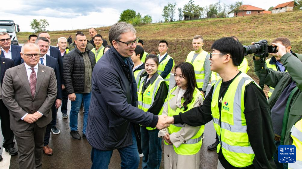 10月4日,在塞爾維亞中部城市上米拉諾瓦茨,塞爾維亞總統(tǒng)武契奇(中)在出席中企承建的繞城公路通車儀式時(shí)與項(xiàng)目建設(shè)者握手。新華社發(fā)(王韡攝)