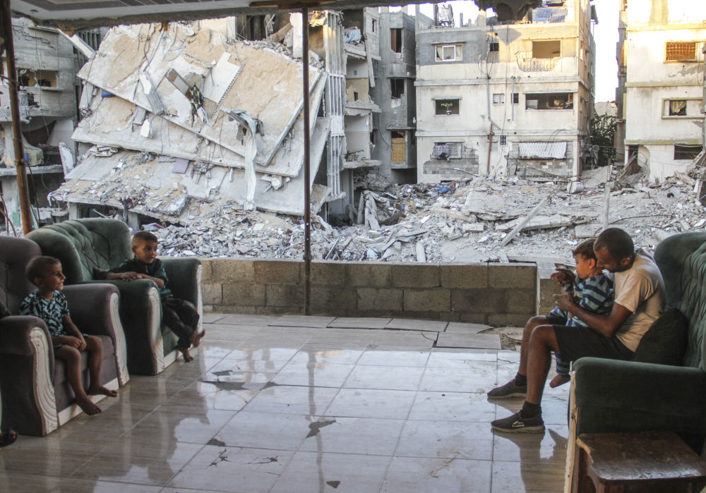 10月6日,在加沙地帶北部杰巴利耶,人們坐在建筑廢墟附近。新華社發(fā)(馬哈茂德·扎基攝)