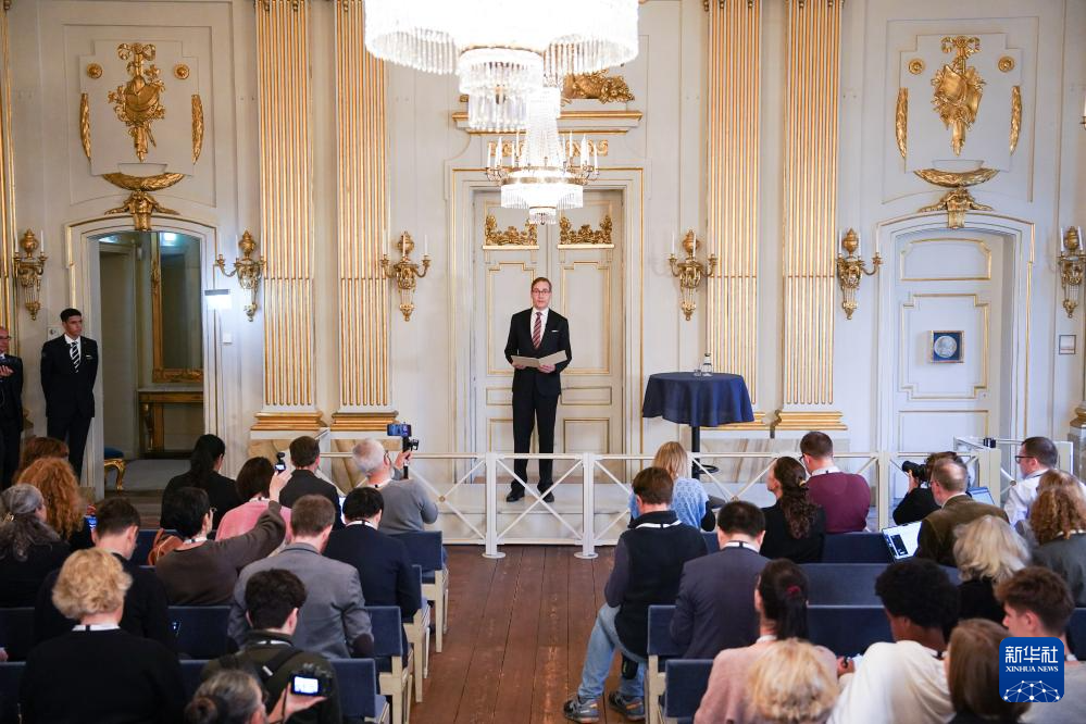 10月10日,瑞典文學(xué)院常任秘書馬茨·馬爾姆在斯德哥爾摩舉行的新聞發(fā)布會上揭曉獲獎?wù)摺P氯A社記者 彭子洋 攝