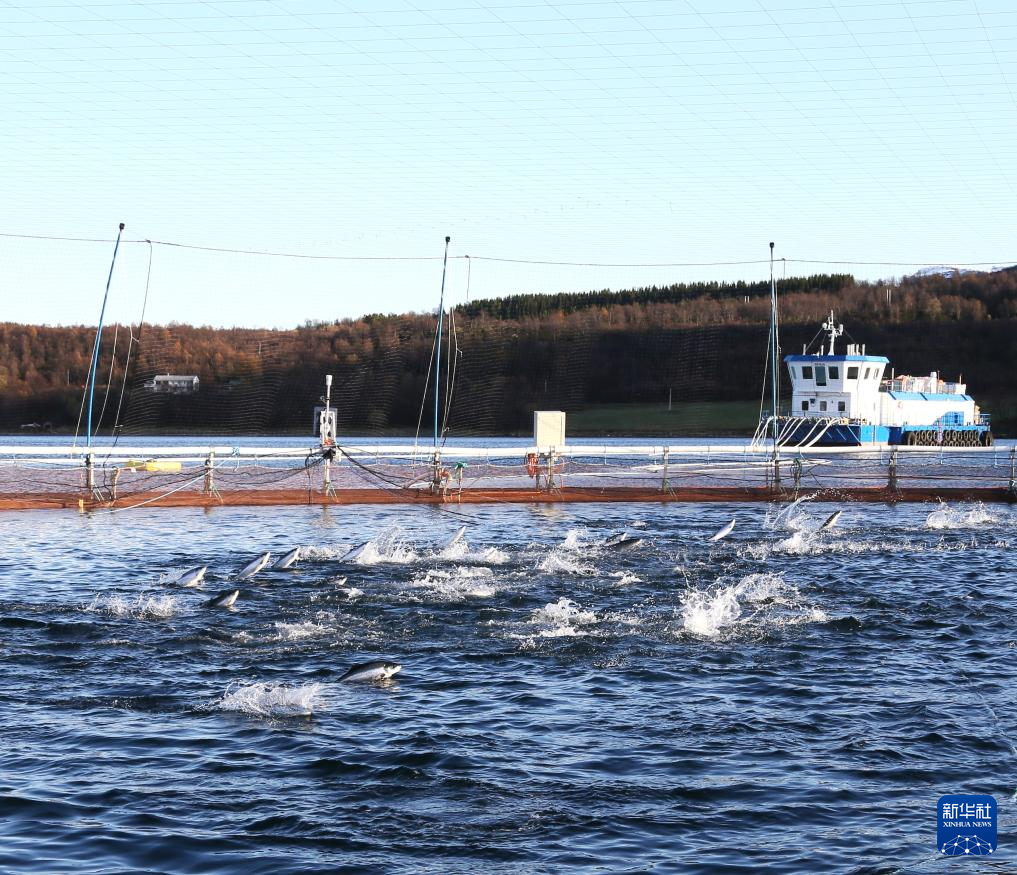 這張2023年10月10日拍攝的資料照片顯示的是位于挪威北部特羅姆斯郡峽灣中的三文魚養(yǎng)殖網(wǎng)箱。新華社記者 張玉亮 攝