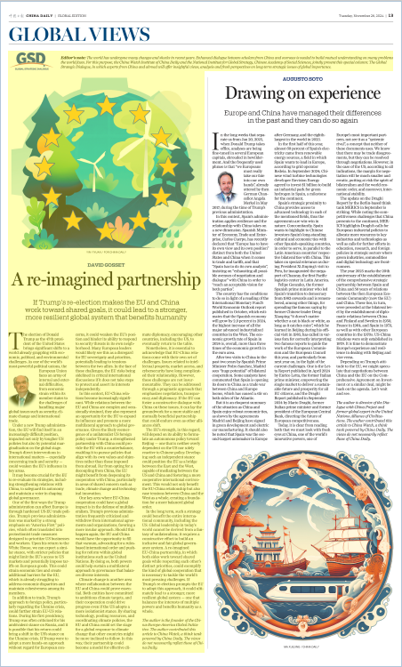 在此背景下,中歐關(guān)系的重要性日益凸顯。盡管歐盟與中國之間的關(guān)系復(fù)雜,甚至偶有摩擦,但這也為歐盟提供了一個擴(kuò)大影響力、推動全球多邊治理的機(jī)會。鑒于特朗普領(lǐng)導(dǎo)下的美國可能重新出現(xiàn)單邊主義外交政策,加強(qiáng)同中國的伙伴關(guān)系可以為歐盟提供一種平衡,使其能夠采取更加符合自身價值觀和目標(biāo)的政策,而不是那些外人強(qiáng)加的政策。歐盟非但不會選擇與中國“脫鉤”,反而可能從更深入的對華合作中受益,尤其是在貿(mào)易、氣候變化和技術(shù)創(chuàng)新等中歐雙方共同關(guān)心的領(lǐng)域。