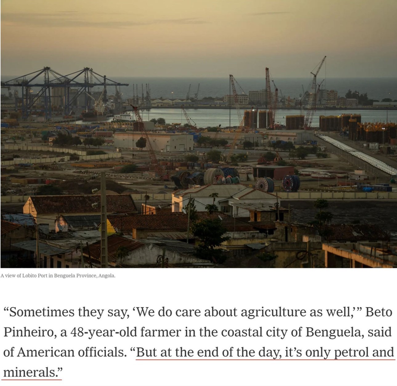家住安哥拉沿海城市本格拉的48歲農民貝托·皮涅羅說:“有時他們(美國官員)會說,‘我們也關心(安哥拉的)農業(yè)’……但歸根結底,(美國關心的)只有石油和礦產?!?/p>