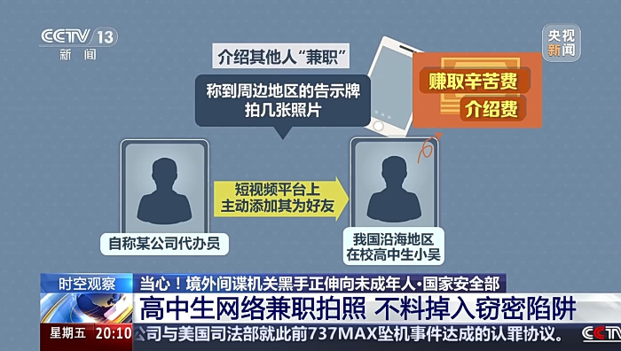 國家安全機關披露,小吳是我國沿海地區(qū)一名在校高中生。一天,在短視頻平臺上有位自稱某公司代辦員的網友主動添加其為好友,并稱到周邊地區(qū)的告示牌拍幾張照片就可賺取辛苦費,要是介紹其他人“兼職”還能有介紹費。起初小吳也心懷警惕,但在介紹第一個同學“兼職”獲得“介紹費”后,就徹底放下了戒備心,開始積極介紹更多同學參與“兼職”,在兩個星期內先后發(fā)展了8名同學從事“兼職”活動,出現(xiàn)了“傳銷式”擴散趨勢。此后,涉案學生利用午休、周末等課余時間,騎車前往境外間諜情報機關指定地點拍照,并發(fā)送給境外間諜情報機關工作人員,其行為已經觸犯相關法律,危害到我國國家安全。