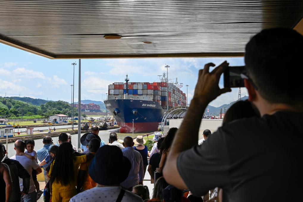 8月28日,在巴拿馬首都巴拿馬城附近,游客在巴拿馬運(yùn)河的米拉弗洛雷斯船閘游客中心觀看貨輪通過船閘駛?cè)胩窖?。新華社記者李木子攝