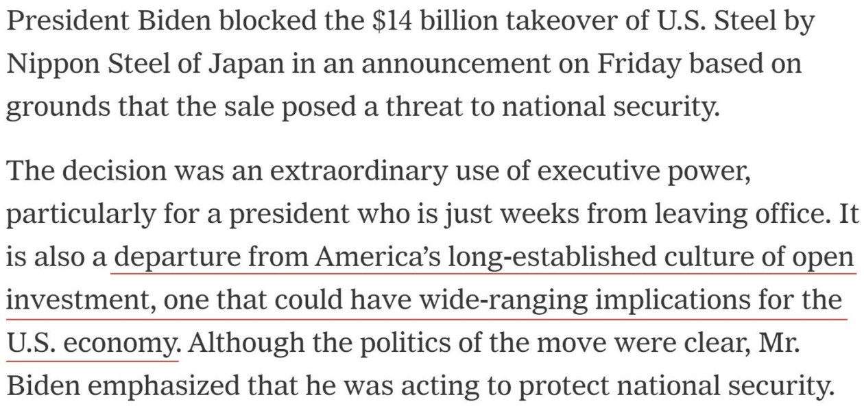 雖然日鐵多次讓步,但美國總統(tǒng)拜登當(dāng)?shù)貢r(shí)間3日發(fā)表聲明,正式阻止了這筆價(jià)值2萬億日元(按目前匯率約合127億美元)的交易。