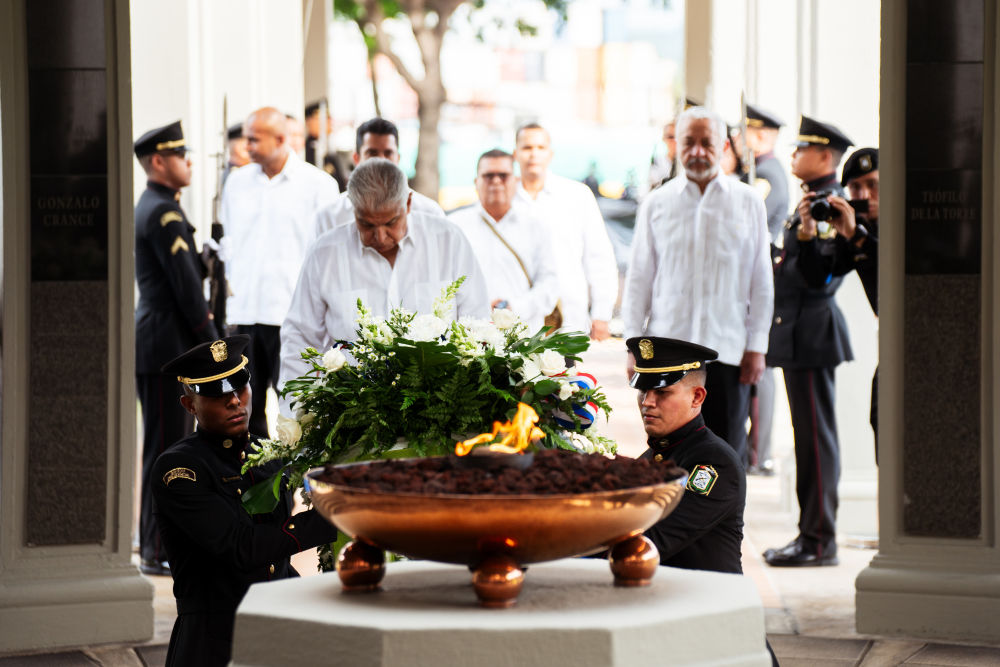 1月9日,在巴拿馬首都巴拿馬城,巴拿馬總統(tǒng)穆利諾(前中)向紀(jì)念1964年“護旗運動”的“永恒之火”紀(jì)念碑獻花圈。新華社記者許詠政攝