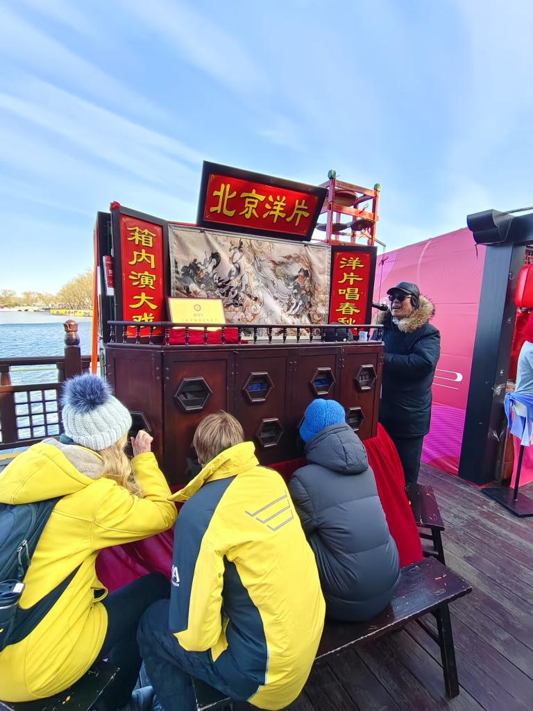 走入北京歷史文化街區(qū)什剎海的新春集市,年味彌漫在文化產品、特色小吃和藝術表演中。不遠處的鑼鼓唱戲聲吸引了母子二人,原來是民間藝術北京洋片在表演《西游記》。坐在一個約1米高、2米寬的木箱前,透過箱上圓孔能看到里面不斷切換的畫片。二人全神貫注的表情,讓人感到不同文化仿佛跨越時空和國度,在這里定格。