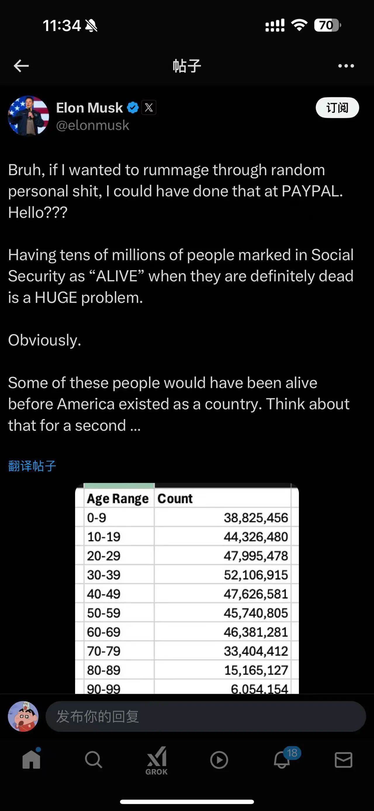 馬斯克周一公布了美國(guó)社保數(shù)據(jù)庫(kù)中,每個(gè)年齡段中“是否死亡”字段設(shè)置為否的人數(shù)。其中存在兩個(gè)問(wèn)題:人數(shù)對(duì)不上和年齡太離譜。