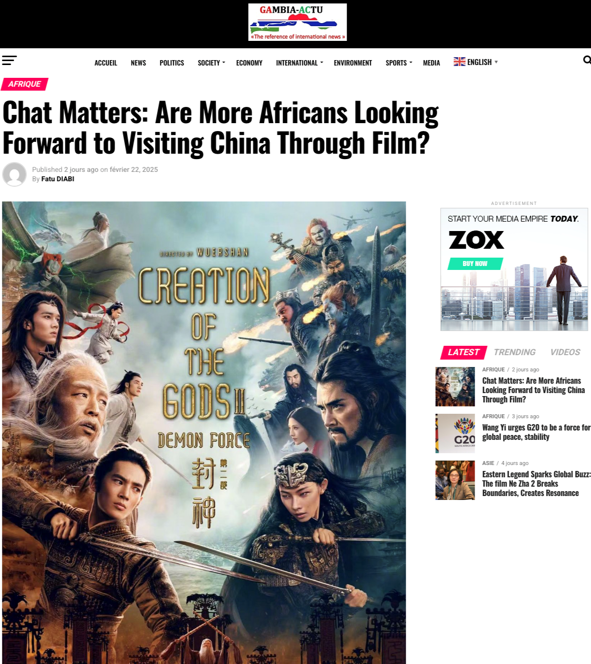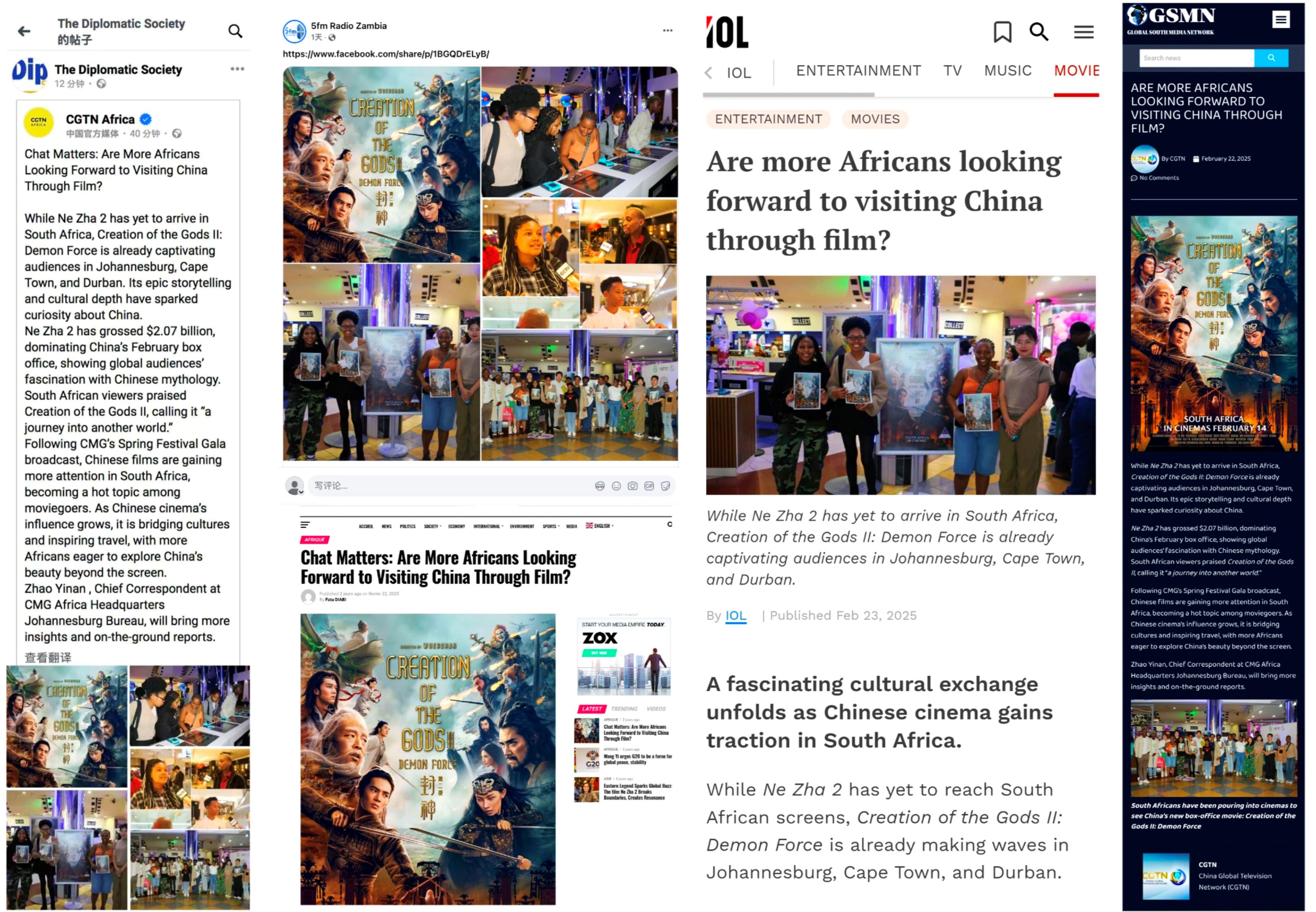 此外,中國春節(jié)檔電影登陸非洲并引發(fā)廣泛影響的相關(guān)報道被肯尼亞廣播公司、南非獨立傳媒、南非《外交圈報》、全球南方新聞網(wǎng)、贊比亞5fm電臺、津巴布韋廣播公司、岡比亞之聲、剛果新聞網(wǎng)等多家媒體轉(zhuǎn)引轉(zhuǎn)載,觸達超1億受眾。