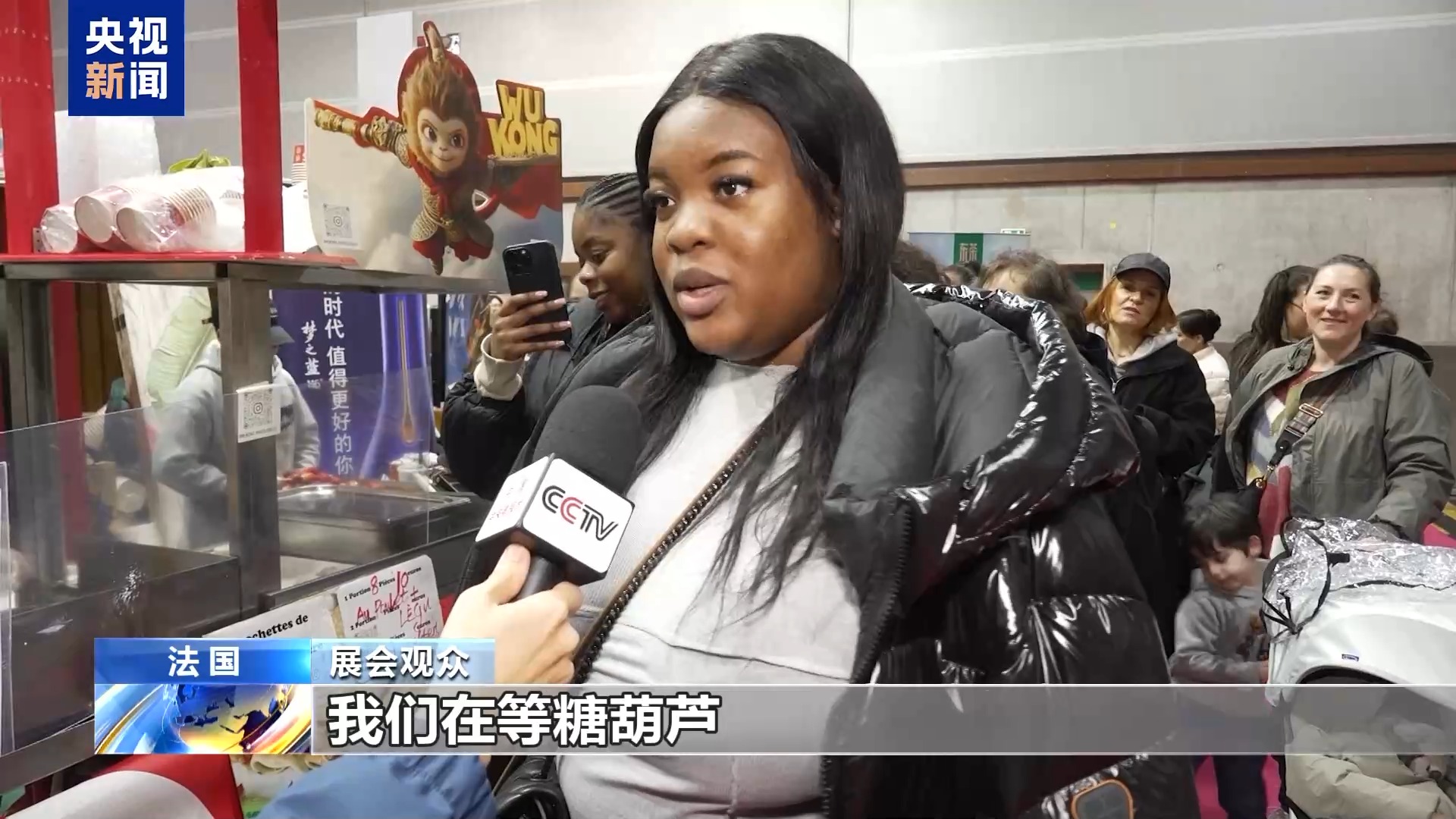 展會觀眾:我們在等糖葫蘆,我們是在社交媒體TikTok上看到的,想嘗一嘗,所以我們就來試試。我們從來沒吃過糖葫蘆,很多味道融合在一起,中國是一個很美麗的國家,人們很友善,很有禮貌。