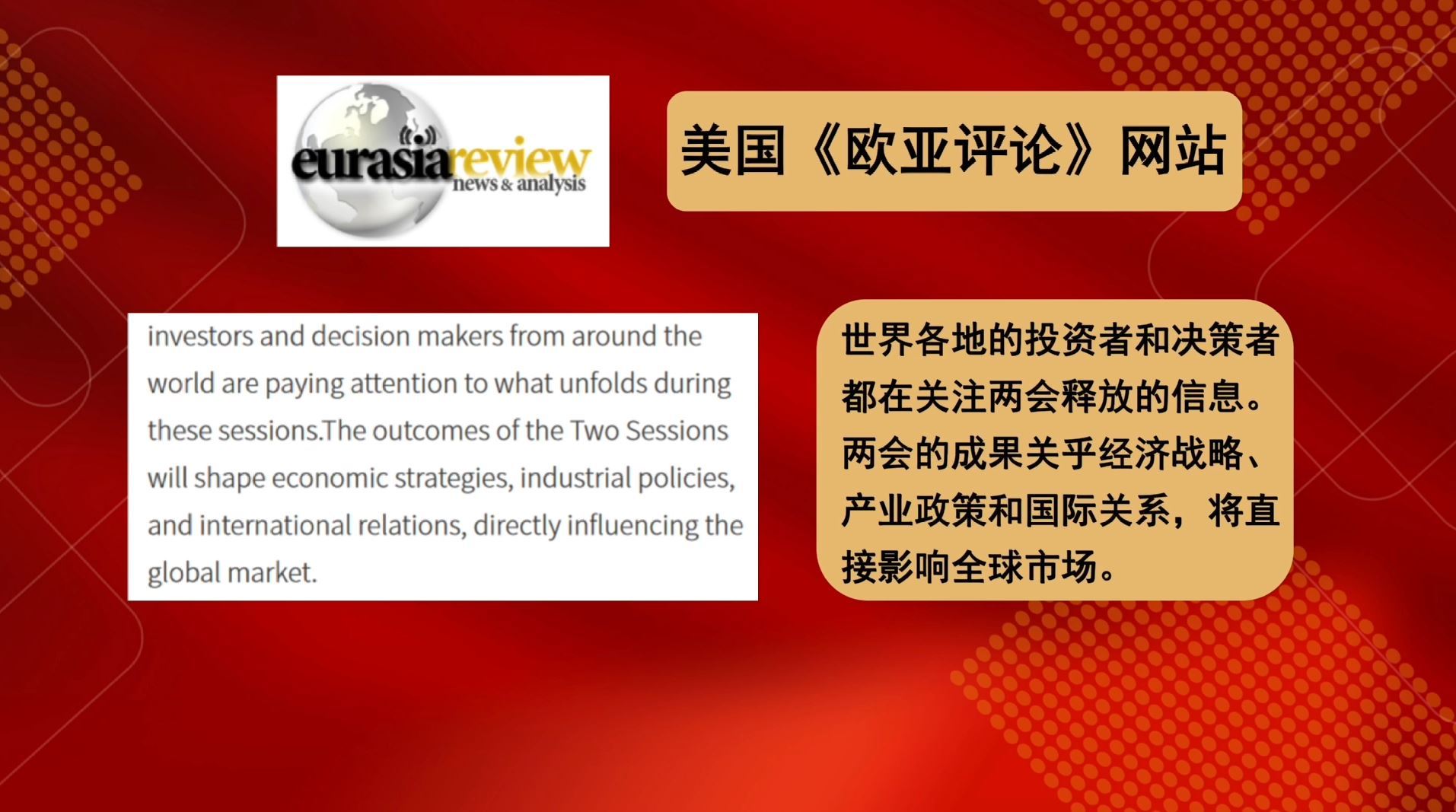 多家外國媒體紛紛用“全球性的重要意義”“直接影響全球市場”“全球的風(fēng)向標(biāo)”“全球感受到兩會(huì)的深遠(yuǎn)影響”這些描述,對中國兩會(huì)對世界的重要性給予高度肯定。