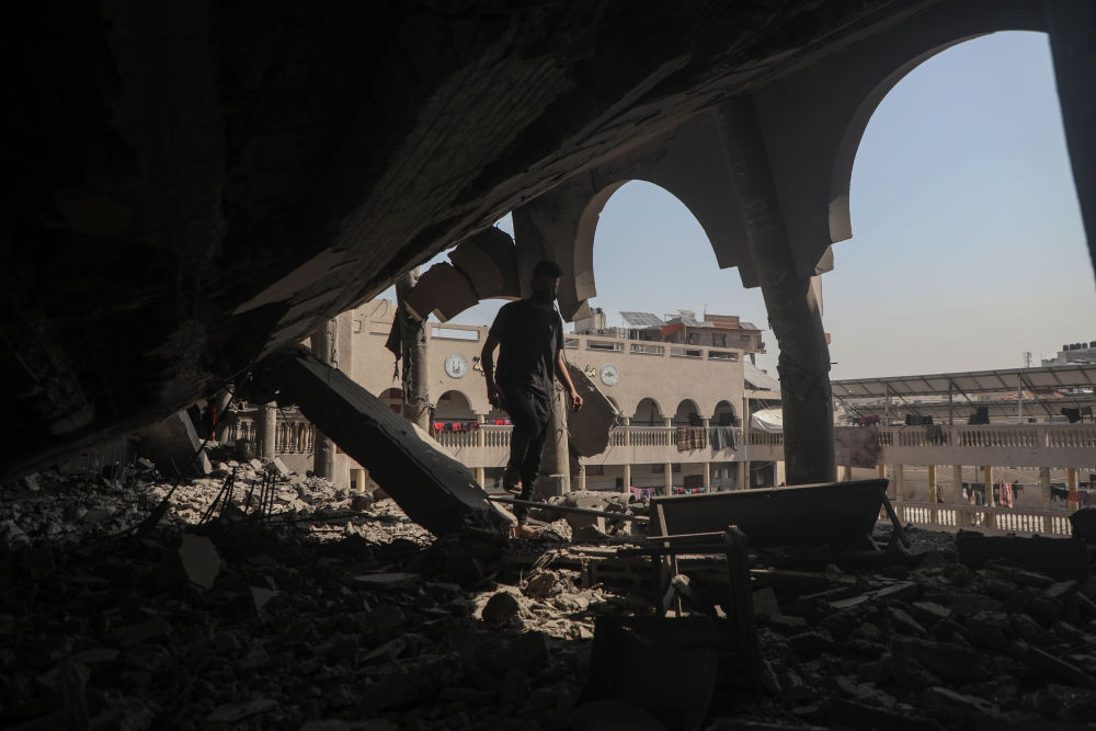 3月18日,在加沙地帶北部加沙城的一處社區(qū),一名男子查看遭以軍空襲損毀的建筑。新華社發(fā)(里澤克·阿卜杜勒賈瓦德攝)