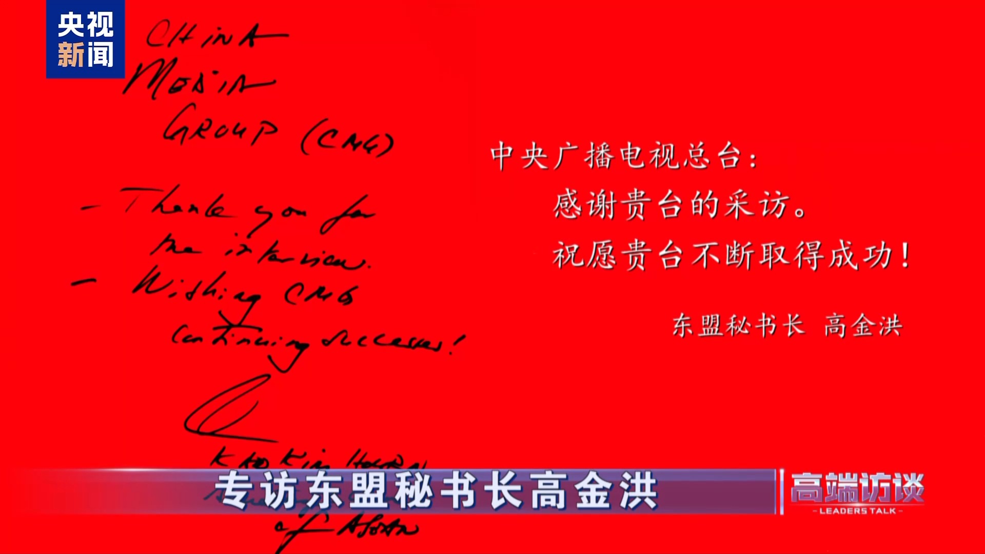 東盟秘書(shū)長(zhǎng)高金洪在接受總臺(tái)專(zhuān)訪后題詞——中央廣播電視總臺(tái):感謝貴臺(tái)的采訪。祝愿貴臺(tái)不斷取得成功!