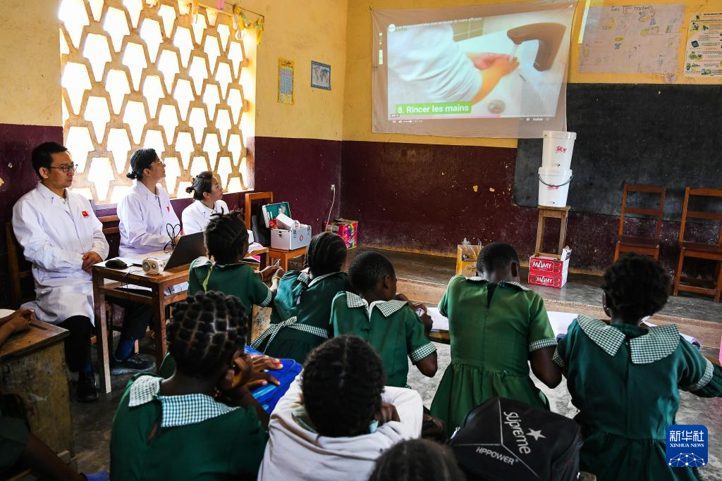 4月3日,在喀麥隆姆巴爾馬約的一所小學(xué),中國(guó)(山西)第24批援喀麥隆醫(yī)療隊(duì)姆巴爾馬約分隊(duì)的醫(yī)生教授學(xué)生預(yù)防傳染病的方法。新華社發(fā)(科普索攝)
