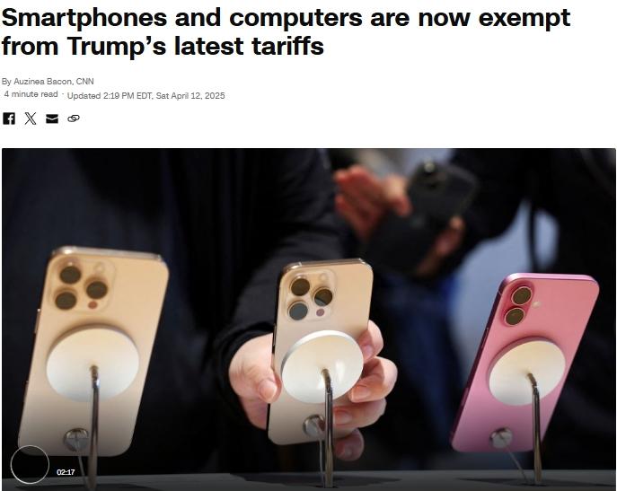 綜合報(bào)道,當(dāng)?shù)貢r(shí)間11日晚,美國海關(guān)與邊境保護(hù)局宣布,聯(lián)邦政府已同意對(duì)智能手機(jī)、電腦、芯片等電子產(chǎn)品免除所謂“對(duì)等關(guān)稅”。