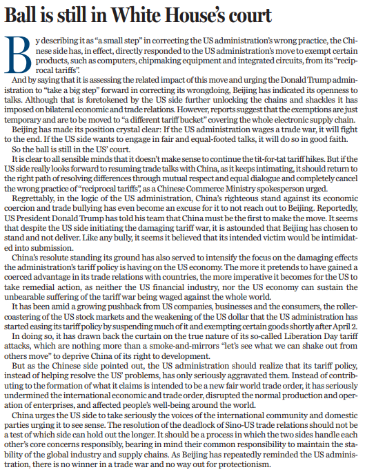 理智之人不難看出,繼續(xù)針鋒相對地加征關(guān)稅已然毫無實際意義。如果美方真如其所暗示的那樣,期待與中國重啟談判,就應(yīng)像中國商務(wù)部新聞發(fā)言人所敦促的那樣,徹底取消“對等關(guān)稅”的錯誤做法,回到相互尊重,通過平等對話解決分歧的正確道路上來。