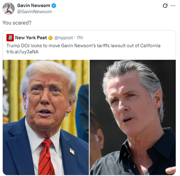 18日,美國加州州長加文·紐森在社交媒體上發(fā)聲,他轉(zhuǎn)發(fā)了一則《紐約郵報(bào)》的新聞消息。這則新聞標(biāo)題為《特朗普的司法部似乎希望把紐森關(guān)稅訴訟的審理地挪出加州》。紐森在轉(zhuǎn)發(fā)消息時(shí)附加了一句評(píng)論:“你害怕了嗎?”