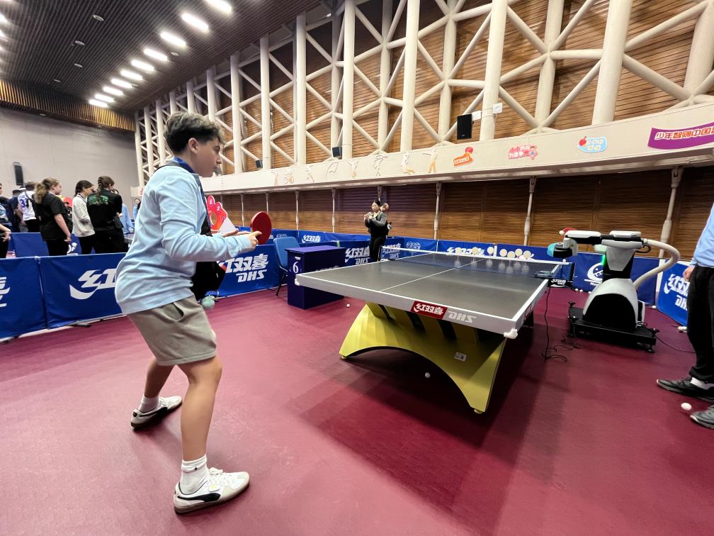 二樓體驗區(qū)的乒乓球發(fā)球機器人前,學(xué)生們輪番挑戰(zhàn)。曾在美國全國U14乒乓球比賽中拿下過第7名的瑞恩·特洛伊·李揮拍上陣,飛快的反應(yīng)速度引發(fā)伙伴們此起彼伏的歡呼和掌聲。