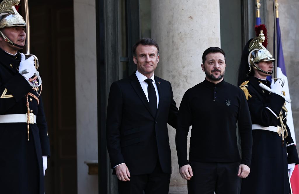 3月26日,法國(guó)總統(tǒng)馬克龍(中左)在巴黎總統(tǒng)府愛麗舍宮迎接到訪的烏克蘭總統(tǒng)澤連斯基。新華社記者高靜攝