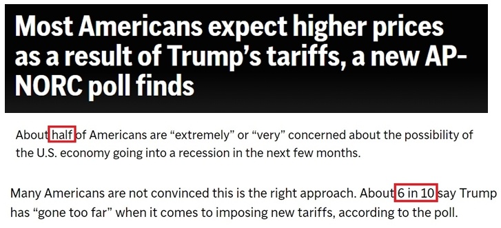 對于特朗普政府的關稅政策,近六成的受訪者認為政府“做得太過了”。另外,約有一半受訪者“極度”或“非?!睋拿绹?jīng)濟會在未來幾個月陷入衰退。