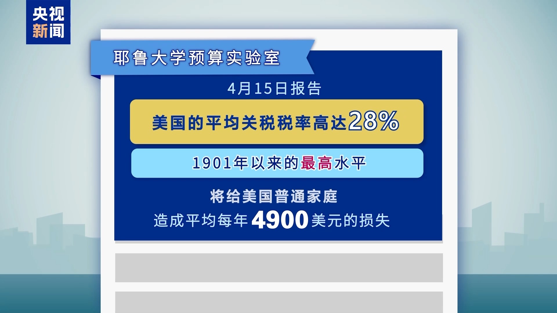 4月15日,在美國與中國、英國達成協(xié)議前,耶魯大學預算實驗室也曾發(fā)布過一份報告。這份報告稱,美國的平均關(guān)稅稅率當時高達28%,為1901年以來的最高水平。按照當時的關(guān)稅稅率,將給美國普通家庭造成平均每年4900美元的損失。