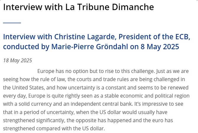歐洲央行行長拉加德日前接受采訪時也表示,近期歐元對美元走強看似有悖直覺,其實源于金融市場對美國失去了信心。這是美國反復無常的關稅等政策造成的,“對歐洲來說是一個機遇”。