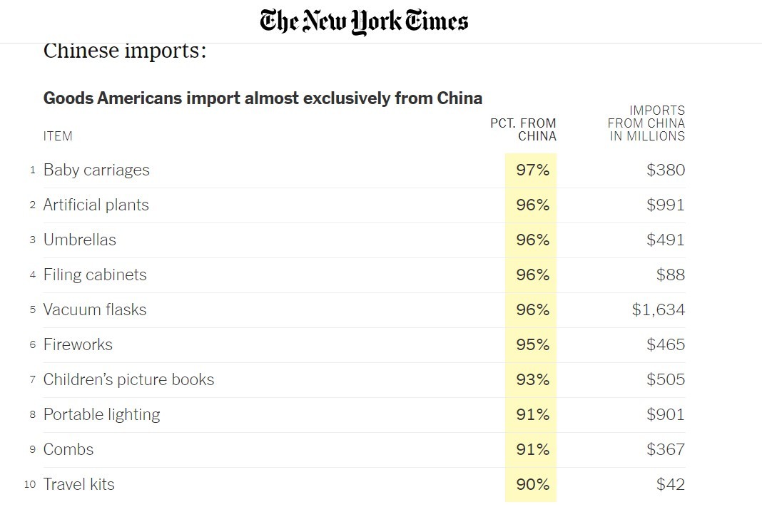 文章說,根據(jù)美國國際貿(mào)易委員會2024年發(fā)布的數(shù)據(jù),中國是美國多個商品品類的唯一或主要進口來源國。具體來看:幾乎完全從中國進口的品類包括嬰兒車、仿真植物、雨傘、煙花、兒童繪本等,進口金額最高的品類主要有電話、計算機、汽車及零部件、視頻顯示器、電熱器、玩具等;進口數(shù)量最大的品類主要是各類塑料制品,包括塑料日用品和工業(yè)用塑料件等。