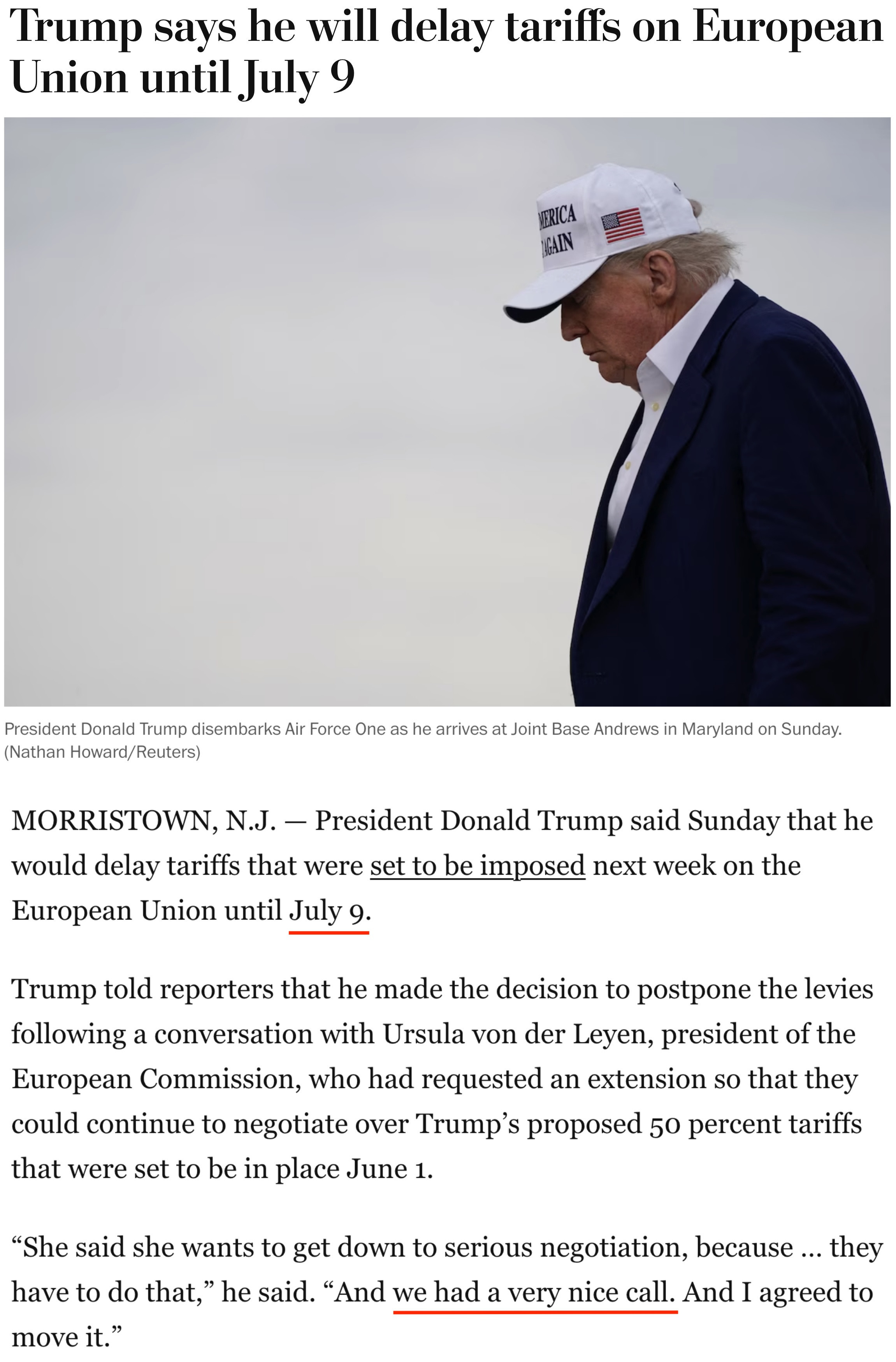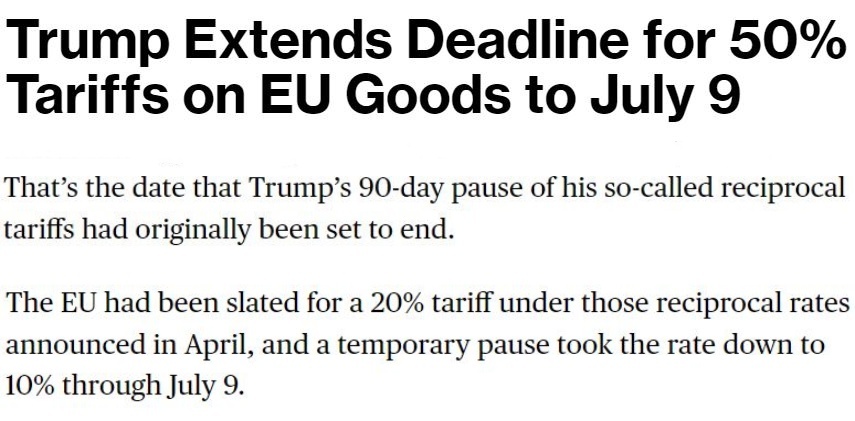他25日告訴記者,自己當(dāng)天與歐盟委員會主席馮德萊恩“愉快”地通了電話,并應(yīng)對方要求,決定將原計劃從6月1日開始對歐盟加征的50%的關(guān)稅推遲到7月9日,以便雙方有時間就此進(jìn)行談判。