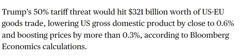 彭博社的計算結(jié)果顯示,50%的關(guān)稅將影響價值高達(dá)3210億美元的美歐商品貿(mào)易,一旦征收,將使美國國內(nèi)生產(chǎn)總值(GDP)下降近0.6%,物價上漲超過0.3%。